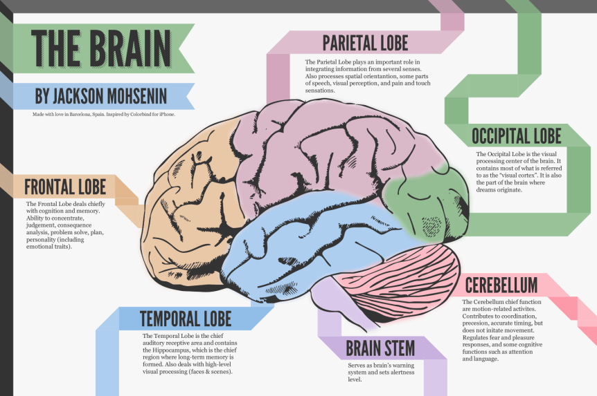 On assignment for Psychology class, Jackson Mohsenin set out to create an infographic that displayed & explained the major sections of the brain and their functions. The brain is extremely complex, and thus the goal was to communicate just enough without overloading the viewer with information. His research on existing brain diagrams showed that they were painfully complex. Dry and uninspired often came to mind.