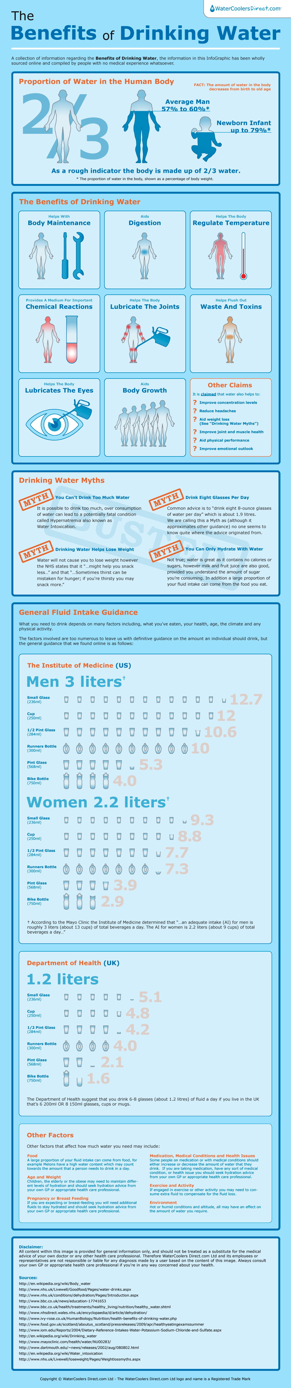 Using information sourced from the likes of the Institute of Medicine (US) and the Department of Health (UK) this InfoGraphic shows the myths and benefits of drinking water.