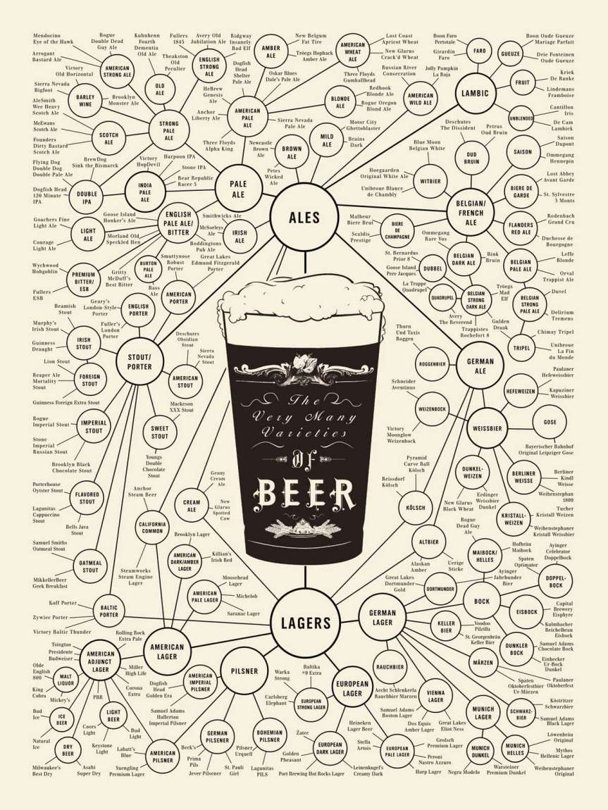 With so many bars boasting about having 1,000 beers on tap, its hard to figure out what to order. This infographic breaks down the many varieties of beer for you. Are you more of an American lager and pilsner fan or do European brews have your heart? Use this chart to figure out which beer you should order for the table when its your turn to buy the rounds and break out of your Bud Light rut with this helpful guide.