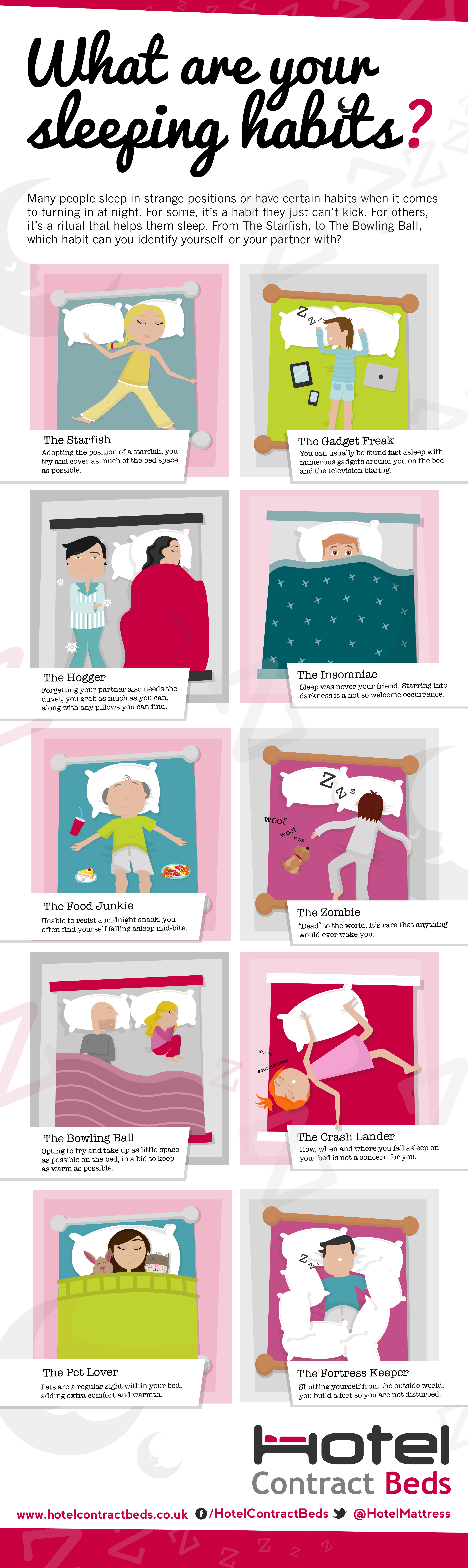 For many of us, sleeping is something we wish we could get more of. Modern day life can be quite hectic at times, which naturally can increases our stress levels. This can play a big part in the way we sleep at night. For some people, shutting themselves off for the night is a breeze. Give them 5 minutes, and they are in the land of nod. However, for others, sleeping is a task that they wish was a lot simpler. The infographic below, illustrates what we feel are the most common sleeping habits. What sleeping habits do you have?