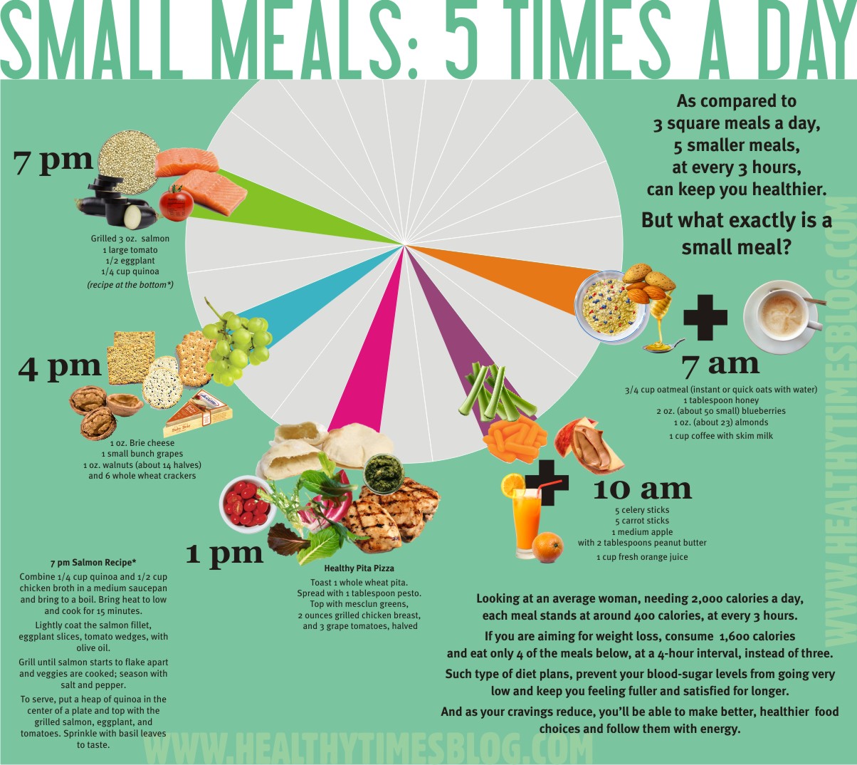 Looking at an average woman, needing 2,000 calories aday, each meal stands at around 400 calories, at every 3 hours. If you are aiming for weight loss, consume 1,600 calories and eat only 4 of the meals in this infographic, at a 4-hour interval, instead of three. Such type of diet plans, prevent your blood-sugar levels from going very low and keep you feeling fuller and satisfied for longer. And as your cravings reduce, you’ll be able to make better, healthier food choices and follow them with energy.