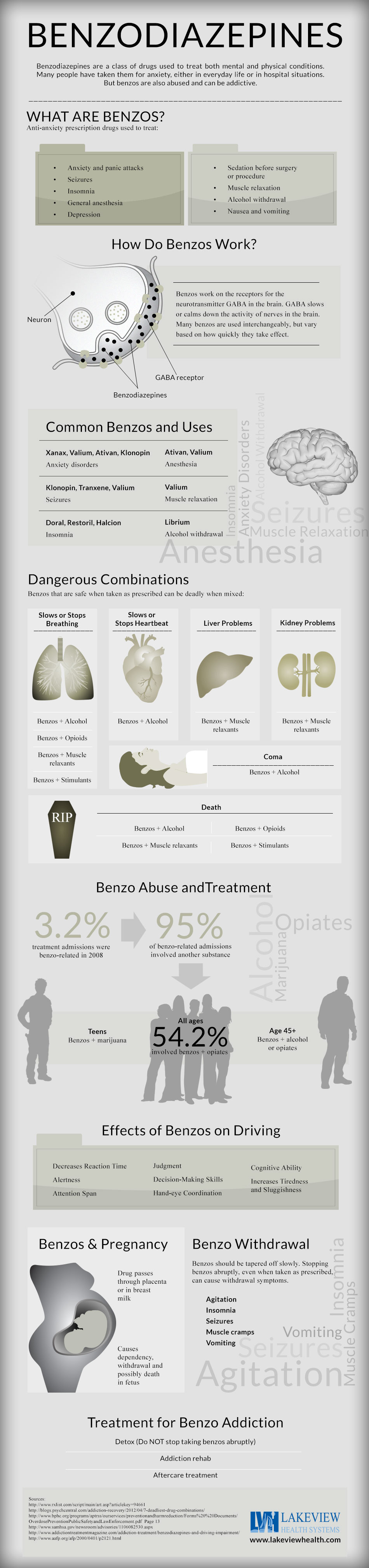 Benzodiazepines, commonly called benzos, are used to treat a wide range of conditions ranging from anxiety to alcohol withdrawal. Although these drugs help a lot of people, they cause harm and even death when misused. What are benzos? What are the effects of benzodiazepines and their common usages and dangers? Get all the answers in our infographic: Benzodiazepines.