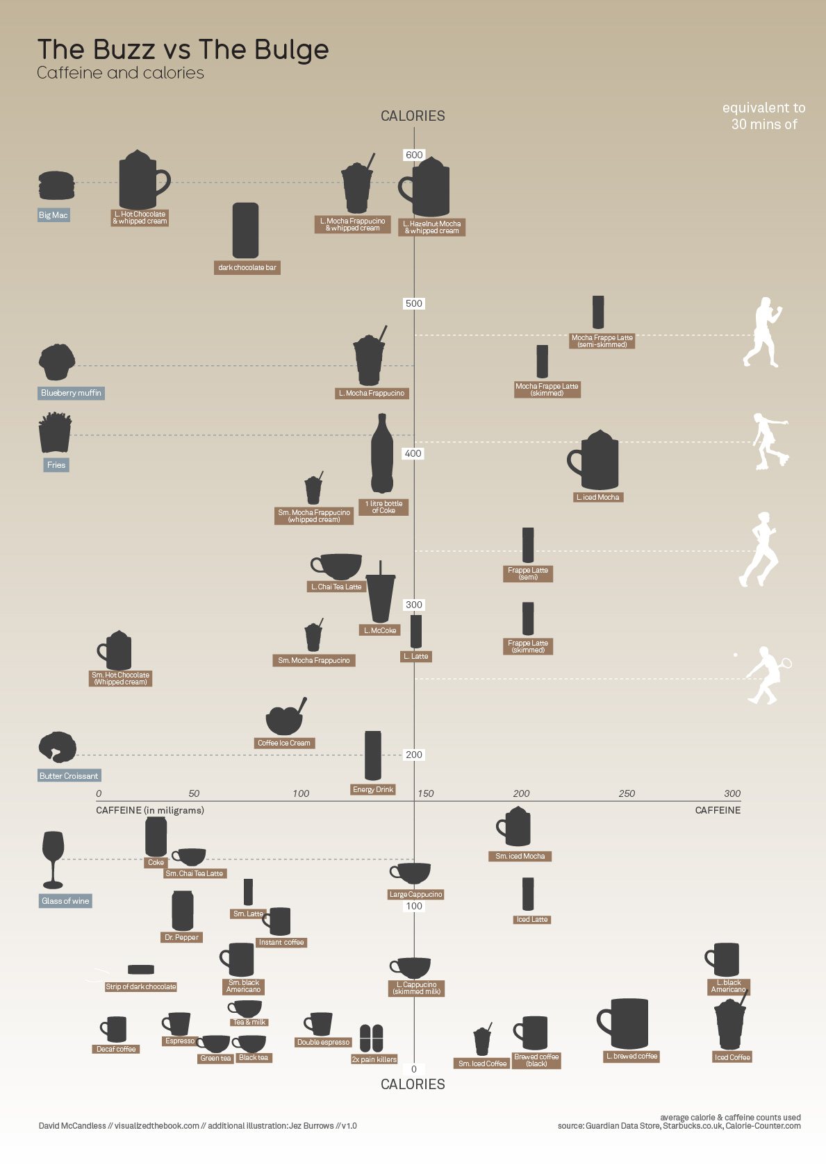 Caffeine and calorie are two very familiar words in the English language and the modern lifestyle. This infographic places the caffeine and caloric content of many popular caffeinated beverages and foods on a quadrant in accordance to calories and caffeine content. Look closely to find your favorites such as the BigMac, a latte, and green tea amongst many more.
