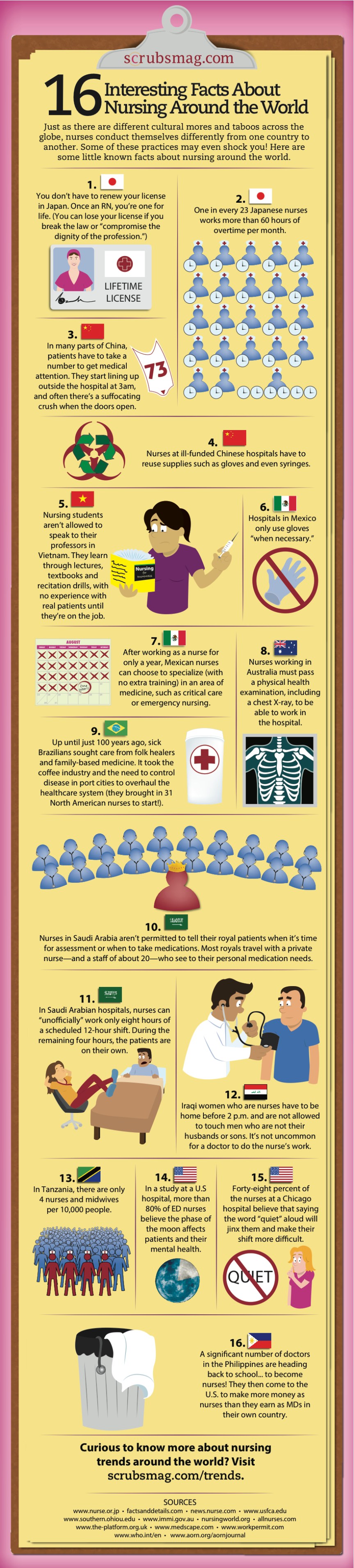 16 Interesting Facts About Nursing Around the World A look at some interesting (and some disturbing) facts surrounding the nursing profession around the world. View Full Size Infographic Source: Unavailable – Contact to claim source Share this: Click to share on X (Opens in new window) X Click to share on Facebook (Opens in new window) Facebook Like Loading... Related