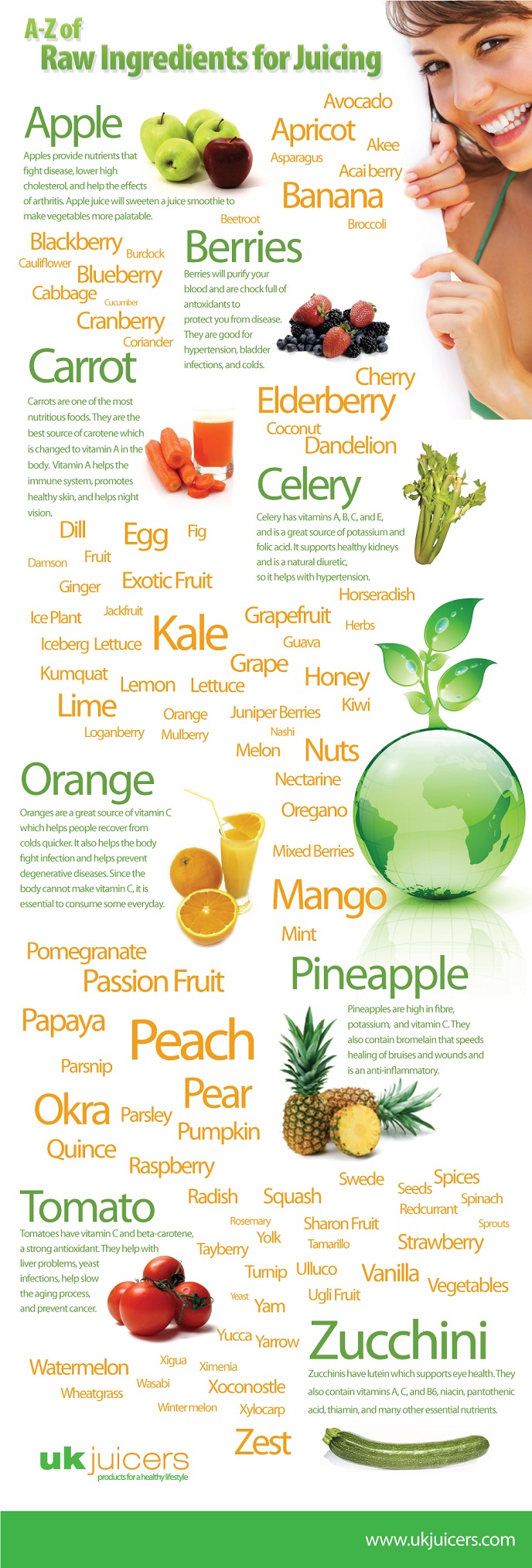 Some of the benefits of juicing include supporting your immune system, slowing the aging process, and recovering quicker from illness. Following are a few popular fruits and vegetables used in juicing and their specific benefits.