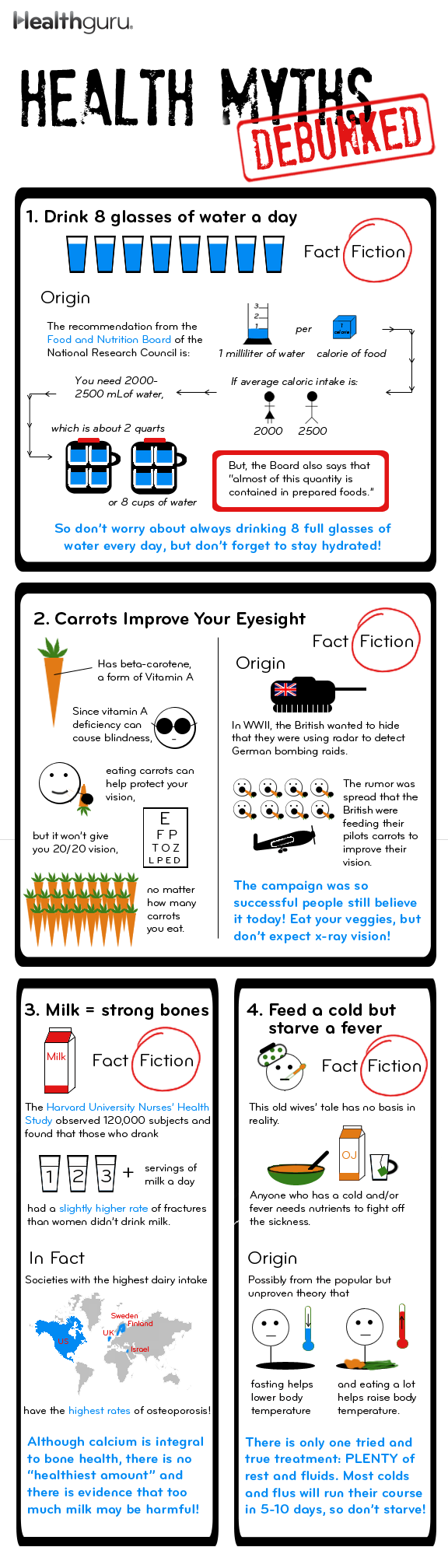 Health Myths Debunked! infographic about health, health benefits, healthy, healthy eyes, healthy living, drinking water, water consumption, health myths, carrots, milk