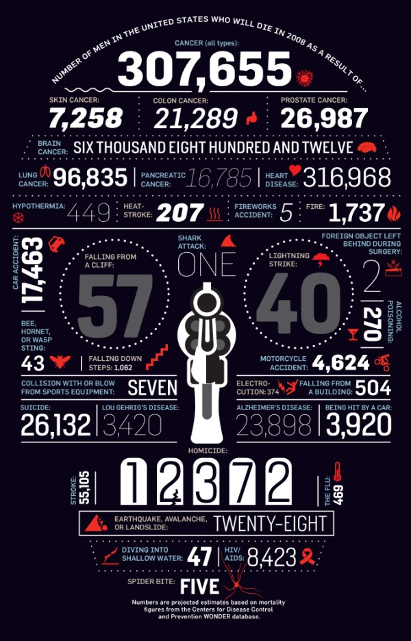 There are indeed many ways for a man to die. One of the leading causes of death in males is cancer in all varieties. But what about other causes of death? From stroke, to suicide, to shark attack, the causes of death for men can seem staggering. Here is representation of just how many men will die by what means.