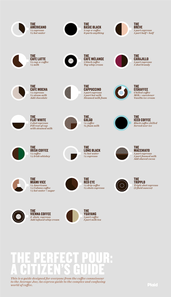 An at-a-glance view at the composition of 20 coffee drinks, from your regular cup of joe to complex concoctions like Eiskaffee and delicious coffee-tea combinations like Yuayuang.
