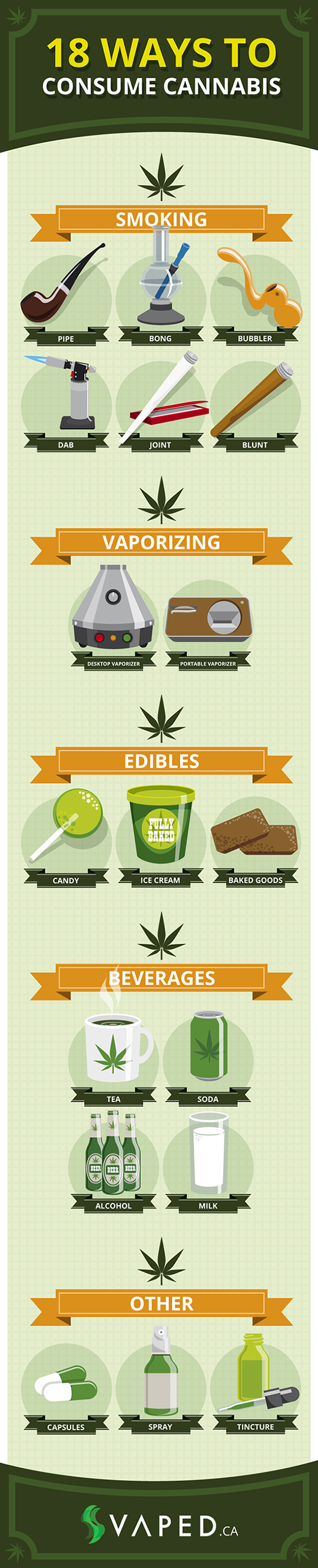 18 Ways to Consume Cannabis Check out the many ways to consume cannabis! There’s smoking, vaporizing, edibles, beverages and more! View Full Size Infographic Source: vaped.ca Share this: Click to share on X (Opens in new window) X Click to share on Facebook (Opens in new window) Facebook Like Loading... Related