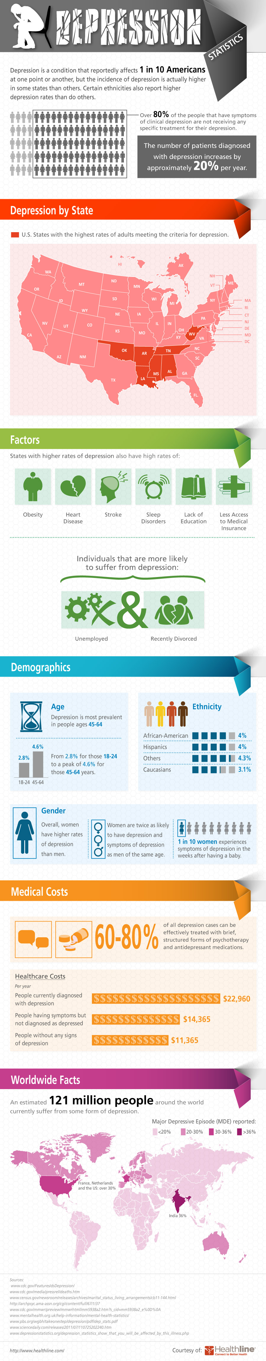 Unhappiness by the Numbers: 2012 Depression Statistics This infographic includes depression statistics , factors, demographics, and world wide facts. View Full Size Infographic Source: healthline.com Share this: Click to share on X (Opens in new window) X Click to share on Facebook (Opens in new window) Facebook Like Loading... Related