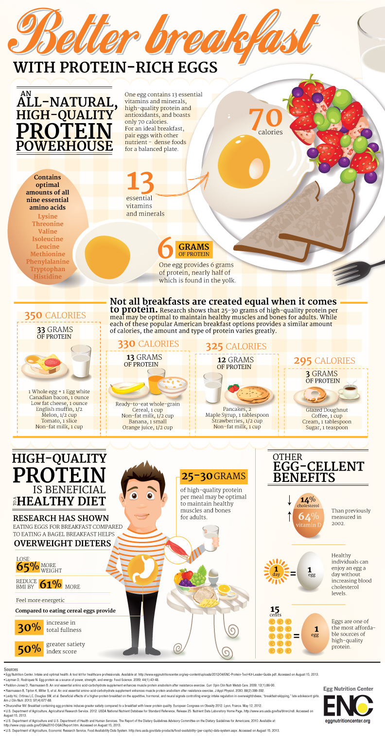 Not all breakfasts are created equal when it comes to protein. One egg provides 13 essential vitamins and minerals, high-quality protein, antioxidants and boasts only 70 calories. Research shows that 25-30 grams of high-quality protein per meal maybe optimal to maintain healthy muscles and bones for adults.