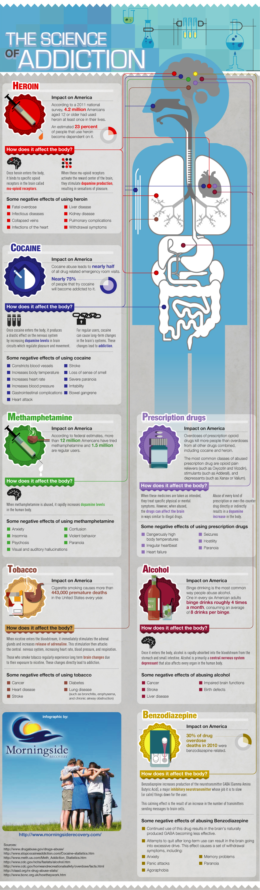 Drug abuse is a constant problem in the modern age, both across the world and throughout the United States. Abusing different substances can lead to addiction and harm a person in many different ways. This infographic looks at several commonly abused substances in America, the science behind those addictions, and the horrendously negative ways the abuse can affect the human body.