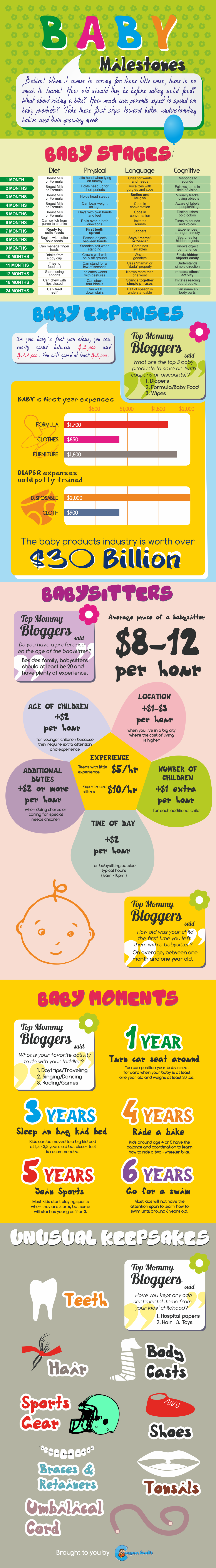 This infographic guides parents on how and when babies usually meet their milestones. This also shows how much parents spent on their babies considering their needs. There are baby stages that majority are experiencing with regards to their diet, physical skills, language and cognitive skills. 1-5 months old babies only needs breast milk or formula milk while 6 months onwards can start from puree and solid foods. They will be able to lift their head in their tummies on their first month and slowly progressing to roll over in both sides at 6 months. First teeth sprout at 7th month and will be able to improve physical skills between 8-24 months of age. Language skill for 1-5 months old babies, usually involve coos, smiles and imitates sounds by 6 months. 8-12 months, they would be able to combine syllables, knows more than one word and can say mama and dada properly. Cognitive skills would usually make more parents happy by seeing their babies tracking moving objects as early as 3 months and are aware of labels on people around them. 7 months old babies already displays stranger anxiety and can distinguish bold colours. As they turn 10 months onwards, they would be able to understand simple directions and finds hidden objects easily. Baby expenses are part of preparations and this infographic shows that the usual expenses will be at most $11,000. Parents spend more on diapers and formula milk as well as their baby sitters which ranges from $8-12 per hour depending on the experience. The infographic also shows baby moments which are important to keep in mind like activities done with daytrips, singing, dancing and reading books.
