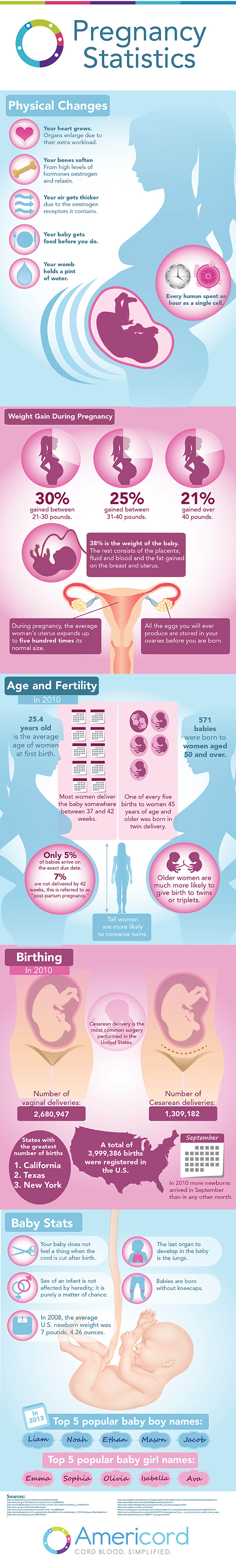 Everyone knows that as you get older, your fertility begins to decline, but did you actually know that older women are also much more likely to give birth to twins and triplets? In 2010, there were about 571 babies born to women over the age of 50! Once youve gotten pregnant, you can expect to see some big changes coming, for one, gaining on average of about 21-30 pounds. But theres no need to fret, about 38% of that is the weight of the baby; the rest consists of the placenta, fluid and blood, and fat mostly gained around the breasts and uterus (which will be expanding up to five times its normal size!). Once those 9 months pass, it will be time for you to decide how your baby will be delivered. Although most cesarean deliveries are required, many women still might prefer to go this route as opposed to a vaginal delivery. The real fun comes when your baby finally arrives! Most likely averaging in at about 7 pounds, the last thing there is to do is decide on your babys name.