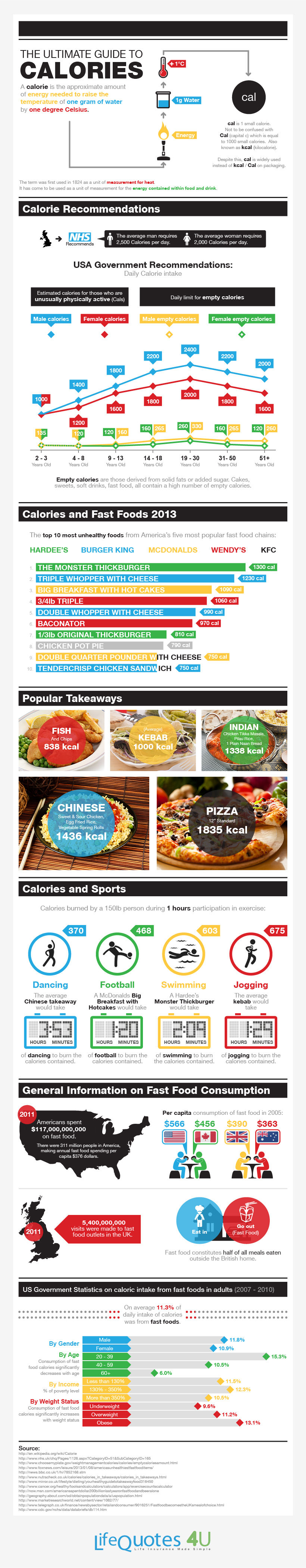 The ultimate infographic guide to calories, including a definition of a calorie, how many are in our favourite takeaways, our daily recommended allowances, the best ways to burn them off and much, much more