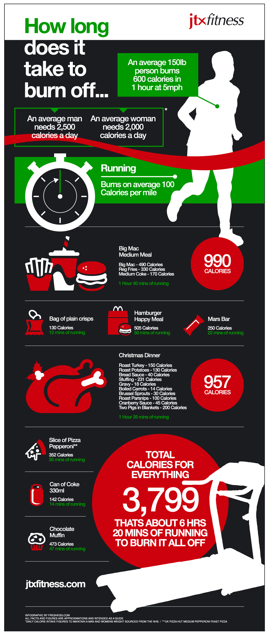 The infographic shows how many calories a single day of eating poor food can add up to and shows how much excercise would be required to burn it all off.
