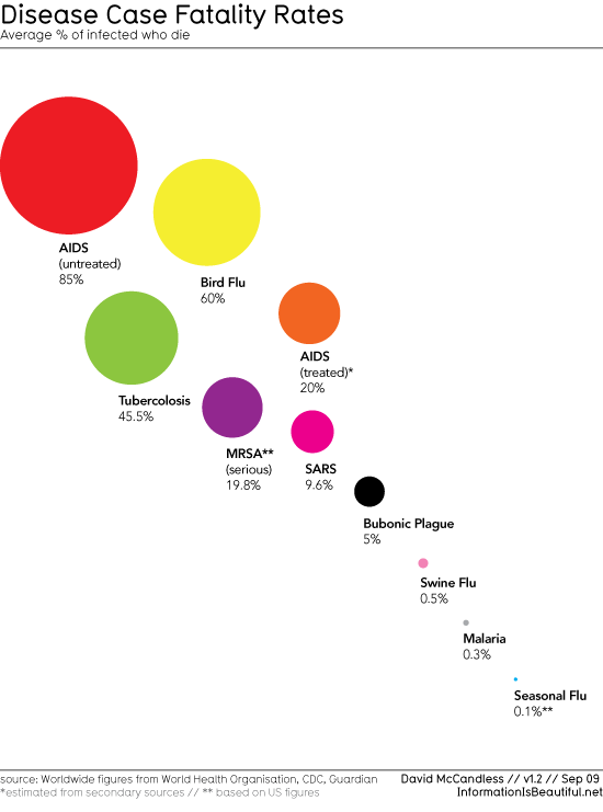 It is a fact of life that many things exist in the world to do us harm or even kill us. There are many deadly diseases that take the lives of thousands throughout the world each year. Which ones kill the most people and which ones are the most harmless? Here is a look at the percentage of infected people who unfortunately pass on from their disease.