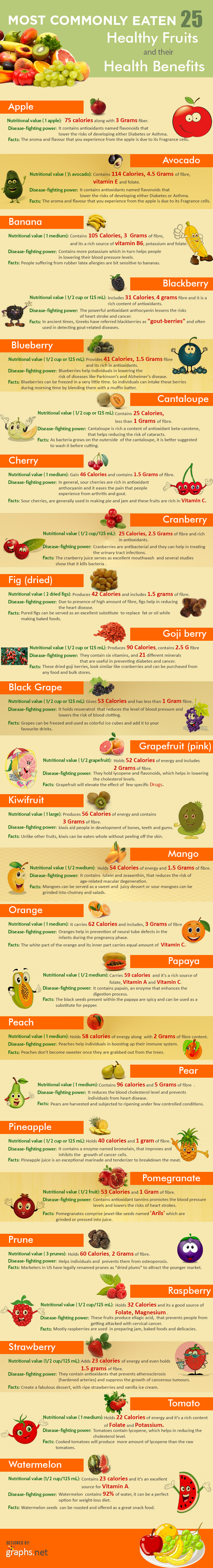 This info graphic provides information on 25 healthy fruits and its benefits. Fruits play an important role for healthy and happy life. Apple is one of the best healthy fruits, it contains 75 calories and 3 grams of fiber.