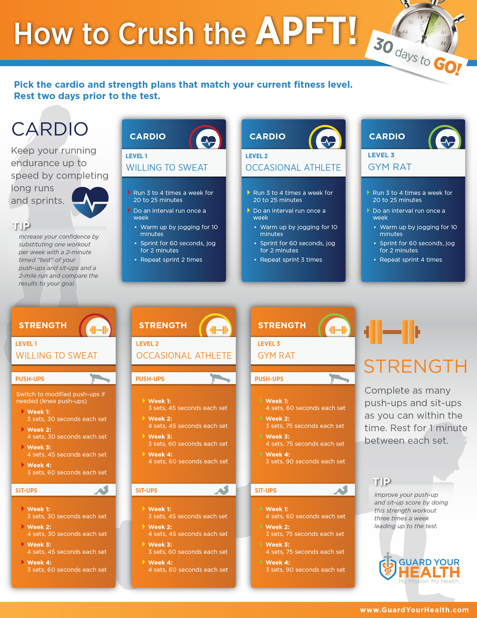 The APFT is a month away. Get training for the APFT with this printable exercise plan today.