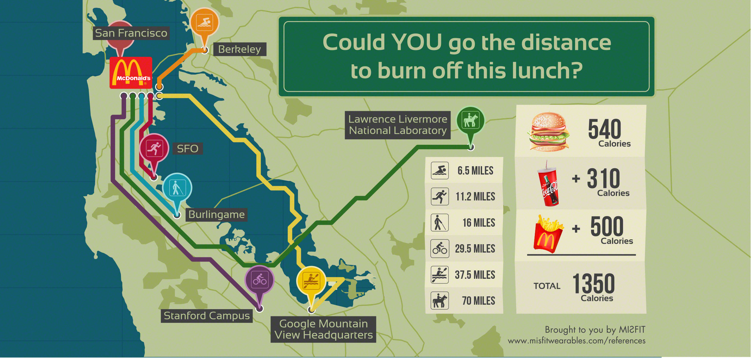 The infographic shows how many calories a single day of eating poor food can add up to and shows how much excercise would be required to burn it all off.