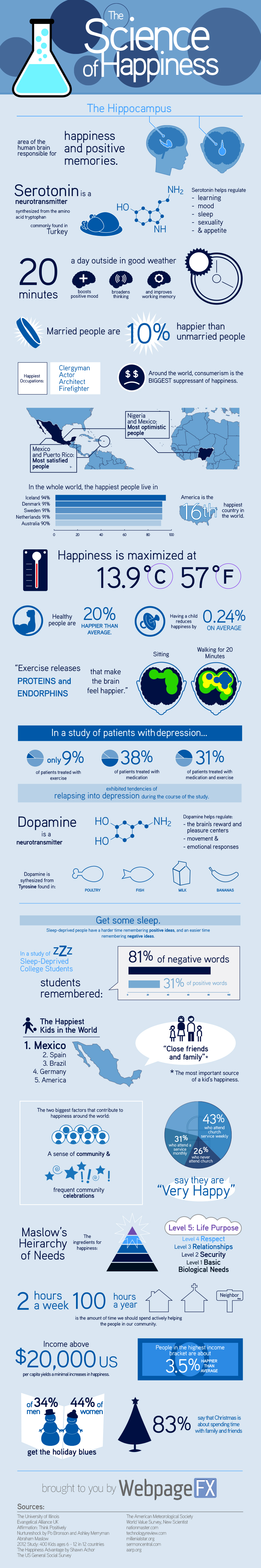 Happiness means different things to each of us, but biology and psychology reveal a lot of factors that contribute to our overall mood and emotions. Read through this infographic to learn tons of easy tips and hacks to improve your happiness levels and better understand how our minds work.